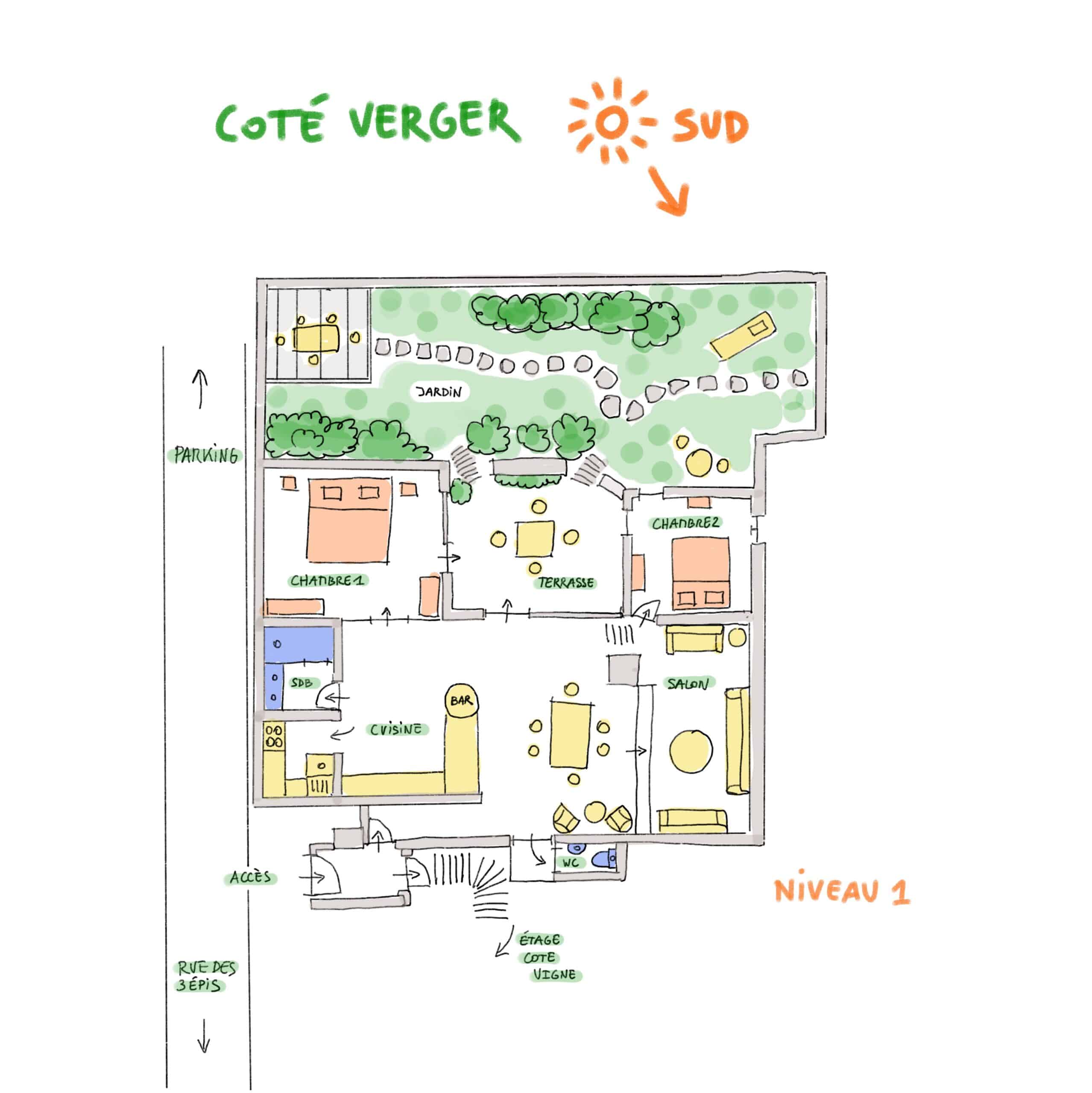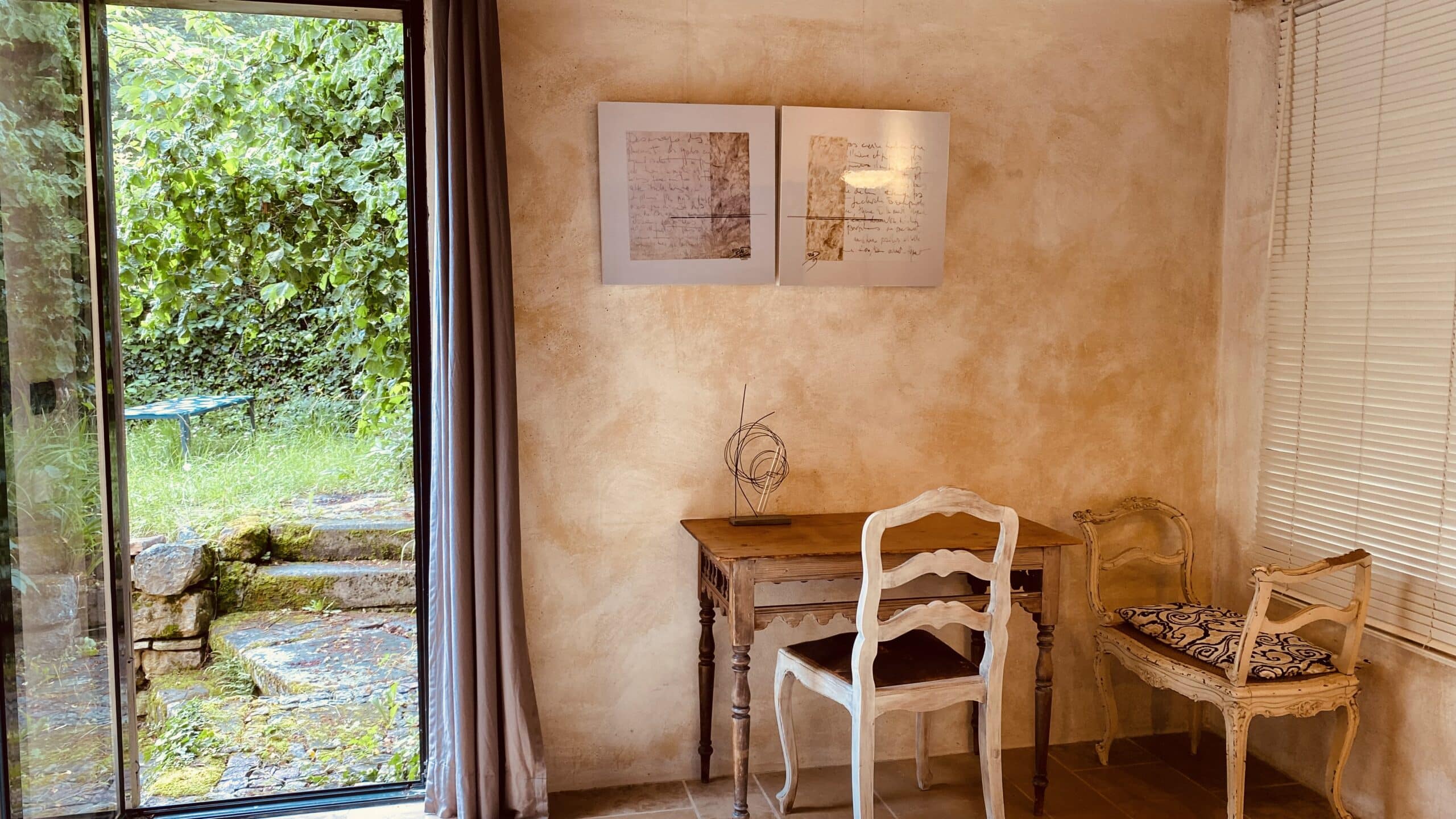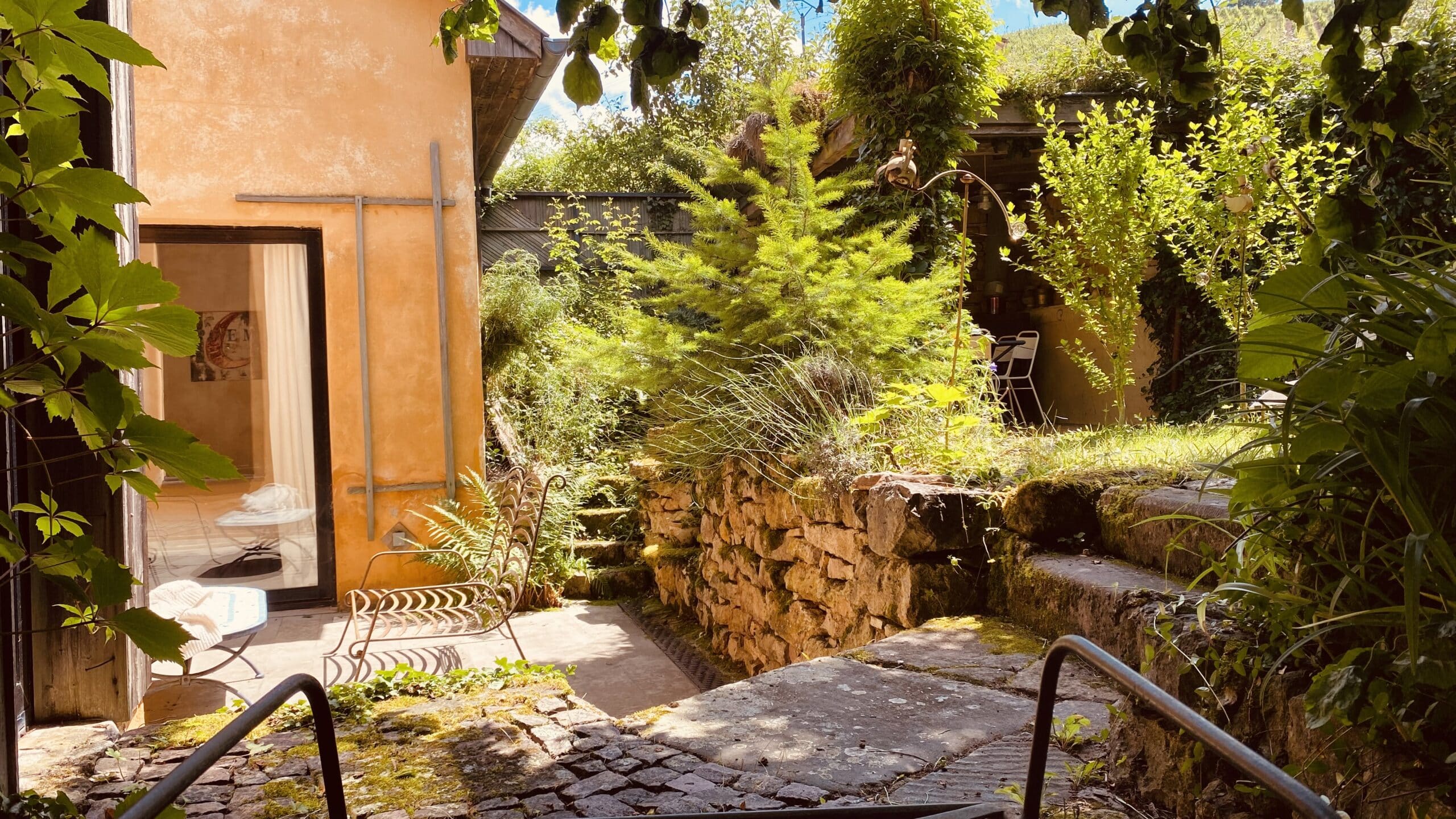 The U-shaped apartment opens onto the south-facing chestnut-tree garden, which stays very cool in summer. Both inside and out, a few levels need to be taken into account for certain people and for young children.
